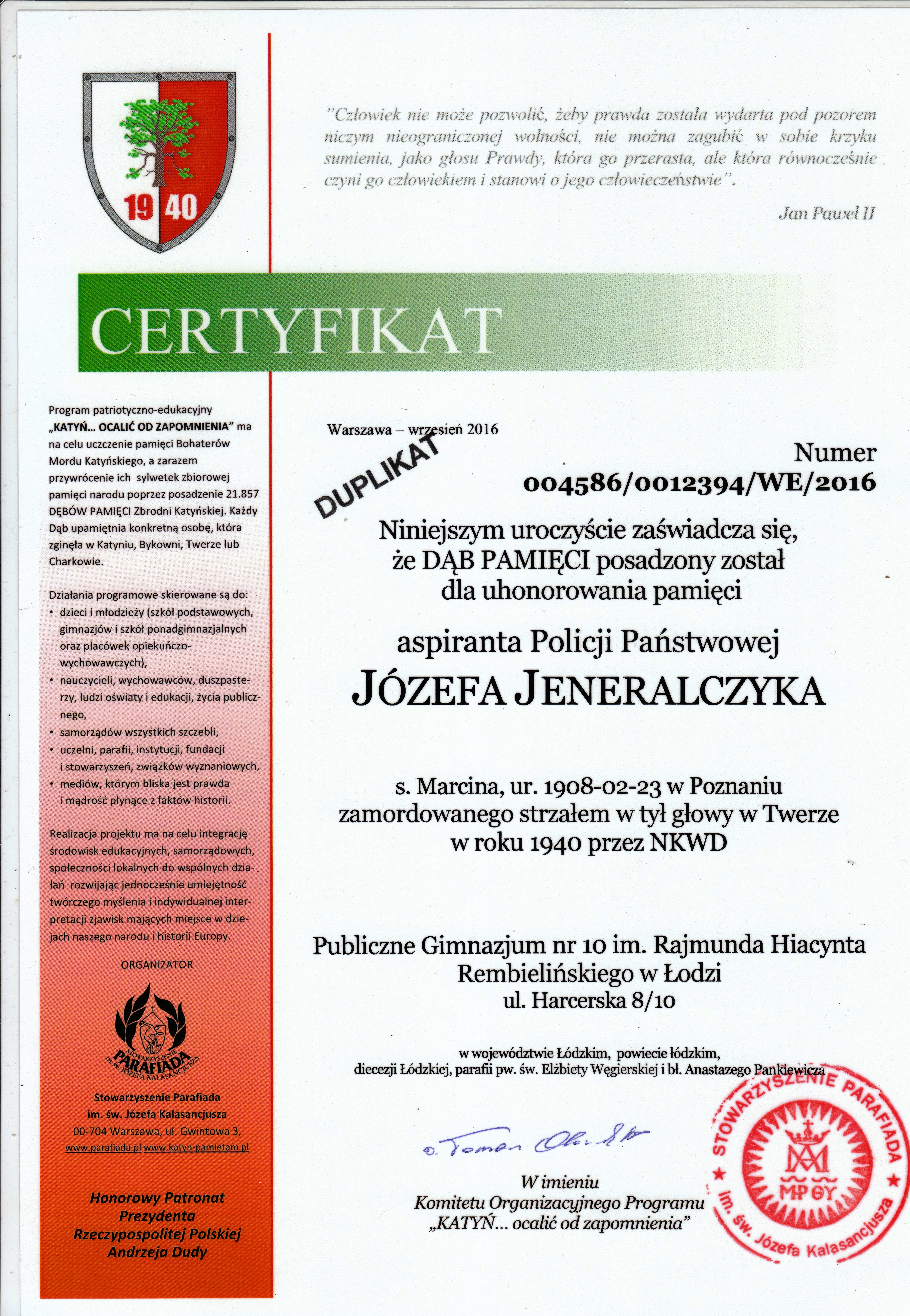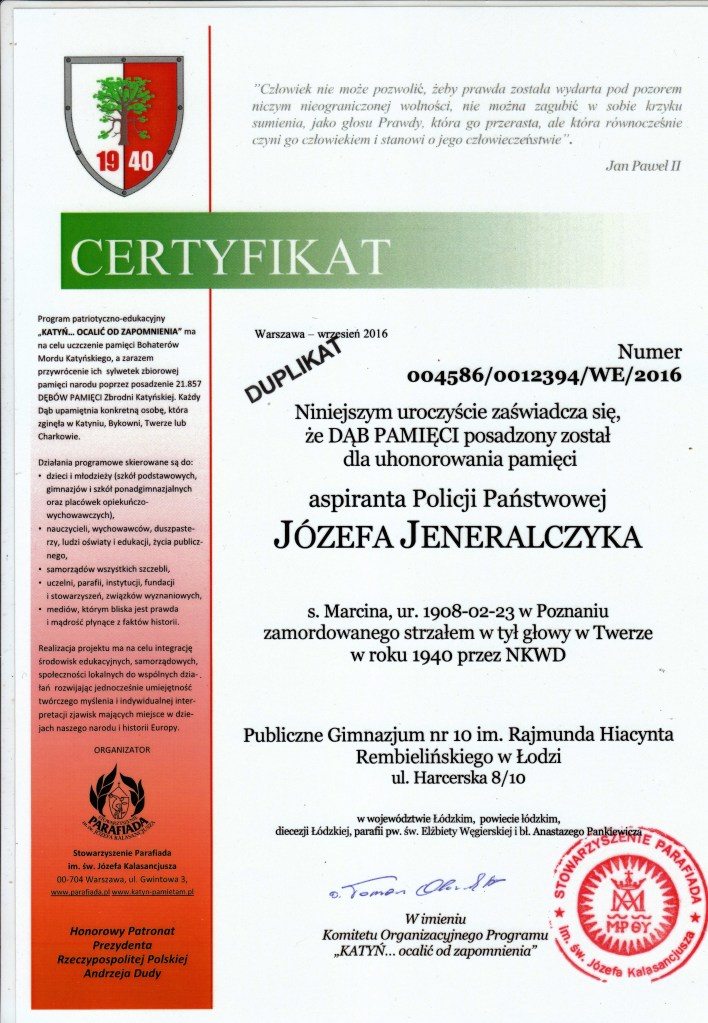 Kopia Certyfikatu Józefa Jeneralczyka, policjanta Komendy Powiatowej Policji Państwowej w Łodzi zamordowanego przez NKWD w 1940 r. w Twerze, pochowanego na Cmentarzu Wojennym Miednoje w Rosji.