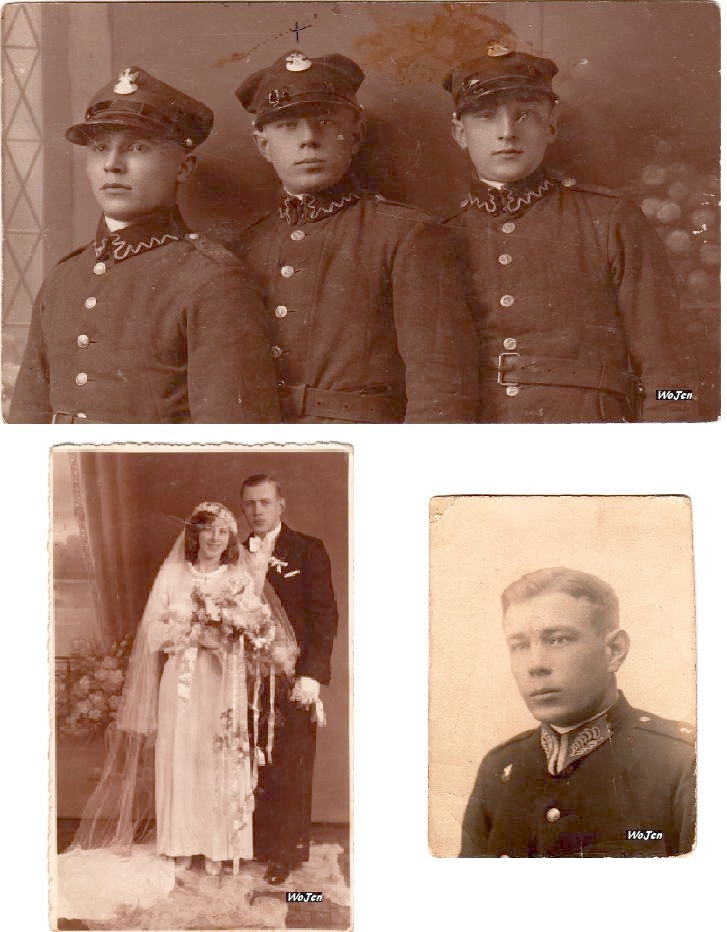 Kolaż zdjęć wysłany do ROPWiM w 2010 roku. Górne to Józef pośrodku z dwoma kolegami, w WP po przysiędze w Łodzi wykonane pp. 1930 roku. U dołu zdjęcie ślubne Józefa z Leokadią Kiss w 1935 roku w Łodzi oraz zdjęcie do Legitymacji Służbowej nr 2457 z 1932 roku.
