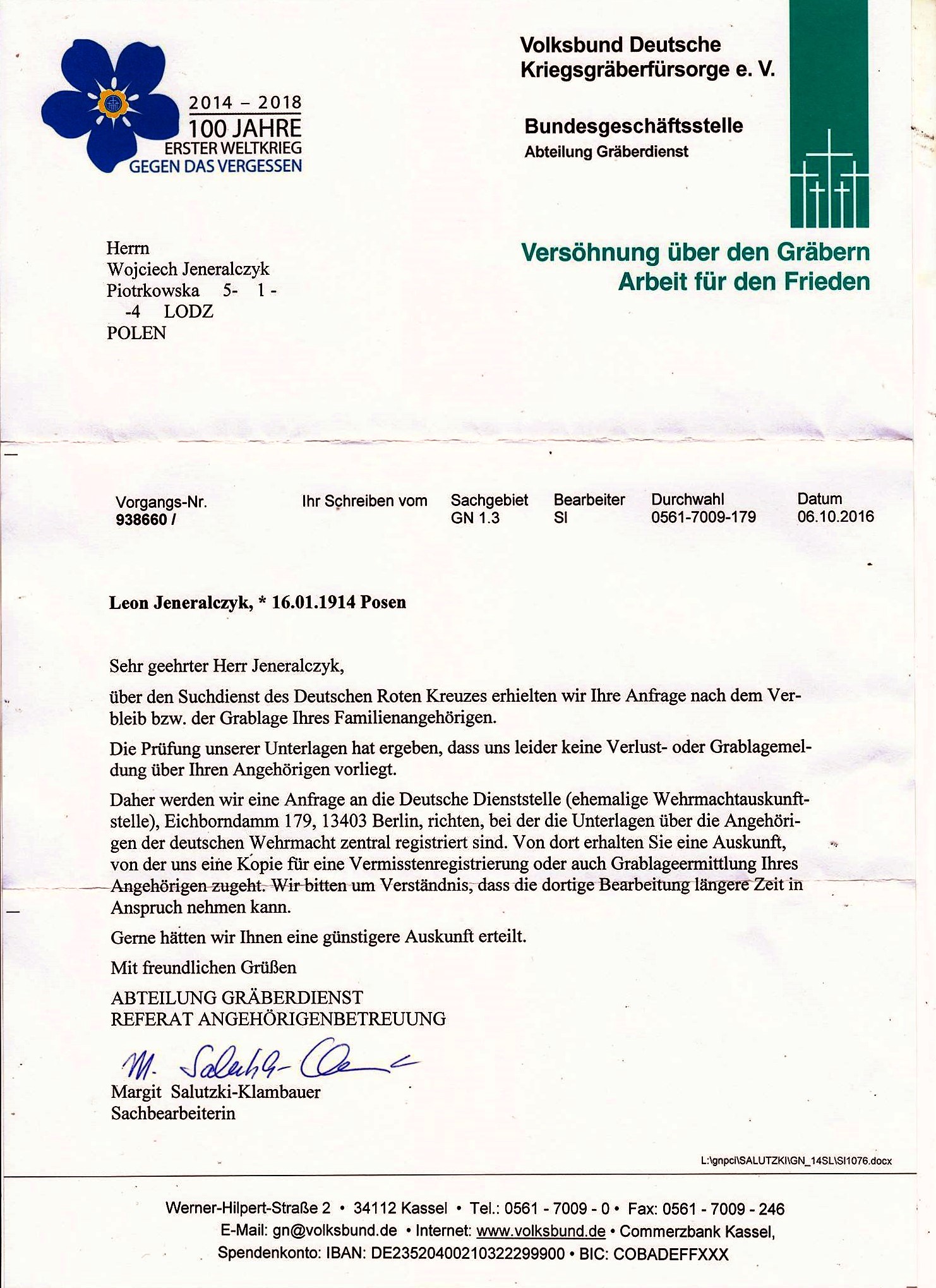 Tłumaczenie głównej myśli pisma : „Skierują zapytanie dalej do wyspecjalizowanej Deutsche Dienstelle w Berlinie przy Eichborndamm 179 która posiada archiwa centralne byłego Wehrmachtu z czasów III Rzeszy podczas II Wojny Światowej…”