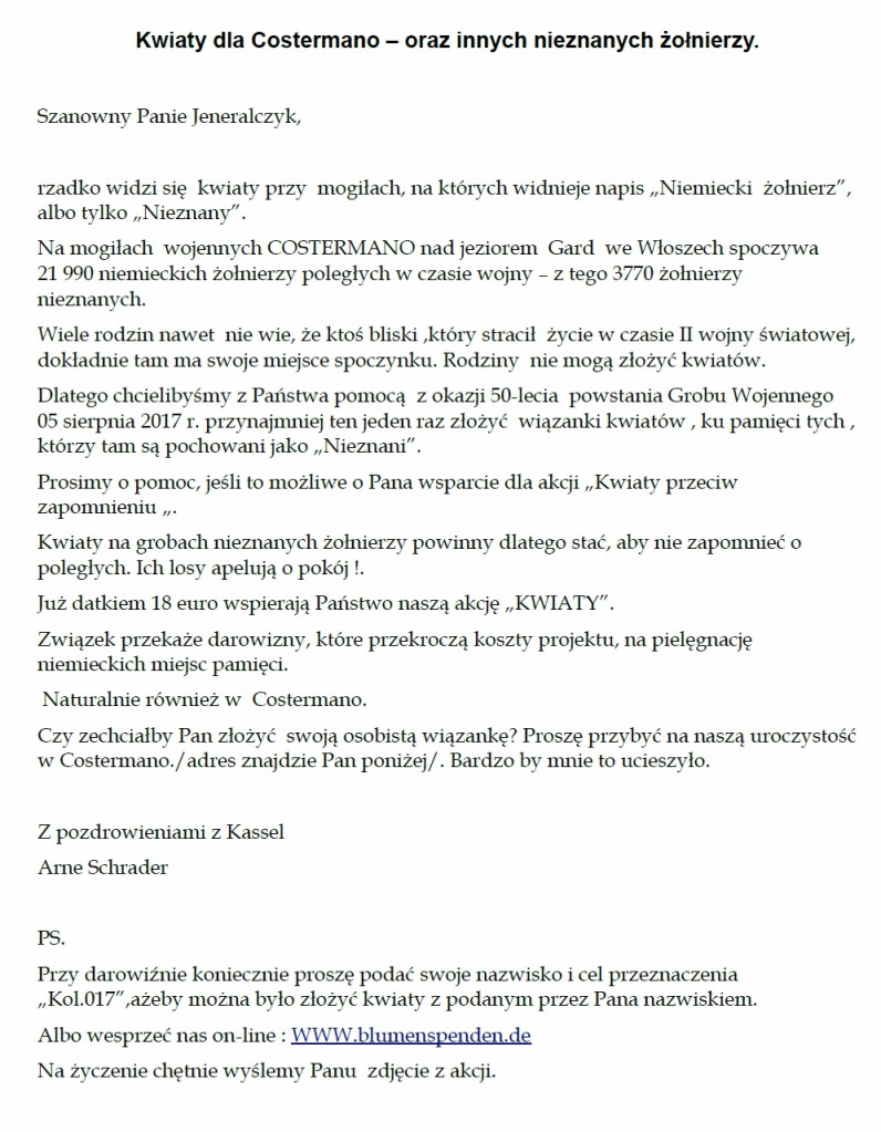 Poprzedni obrazek Następny obrazek Odp-L Tekst polski mojej odpowiedzi na propozycję dotowania dekoracji grobów niemieckich żołnierzy w akcji „Kwiaty dla Costermano”