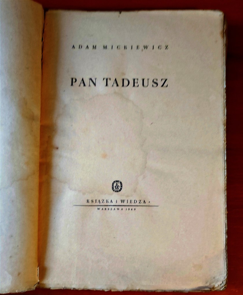 Poprzedni obrazek Następny obrazek PanTad-2 Strona tytułowa pierwszego powojennego wydania Pana Tadeusza z 1949 roku, wolumin znajduje się w zbiorach rodziny od daty ukazania się w księgarniach.