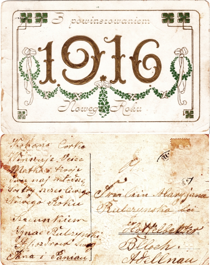 Kartka_1916 Kartka z Życzeniami Noworocznymi pisane przez dziadka do najstarszej córki Marianny Kartka z Życzeniami Noworocznymi pisane przez dziadka do najstarszej córki Marii