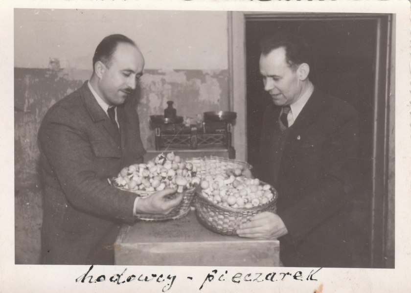 Poprzedni obrazek Następny obrazek HodowcyPieczarek Hodowcy pieczarek, dyrektor Władysław Jeneralczyk i kierownik Restauracji Hotelowej pan Kluska 1947 rok