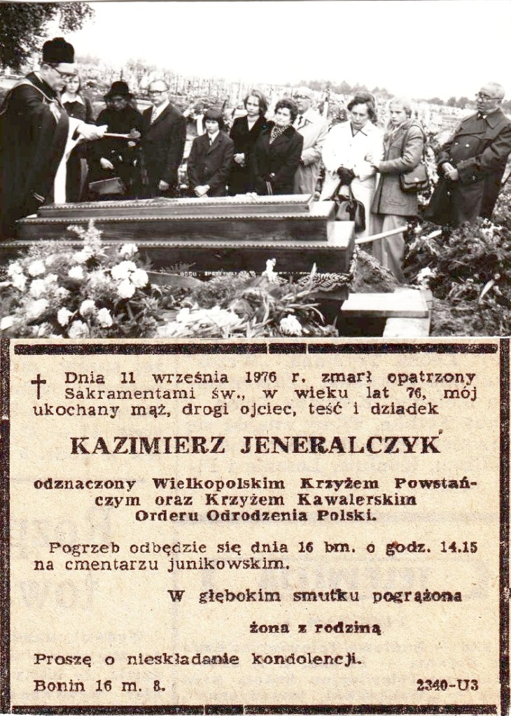 Poprzedni obrazek Następny obrazek Kaz_Jen_1 Pogrzeb Kazimierza w 1976 roku, od lewej ksiądz Seweryn Tomczak – kuzyn, wnuczka Ewa, wdowa Helena, syn Edward, wnuk Jacek, wnuczka Hania, synowa Barbara, brat Władysław, siostra Maria Teresa z córką, szwagier Trytt