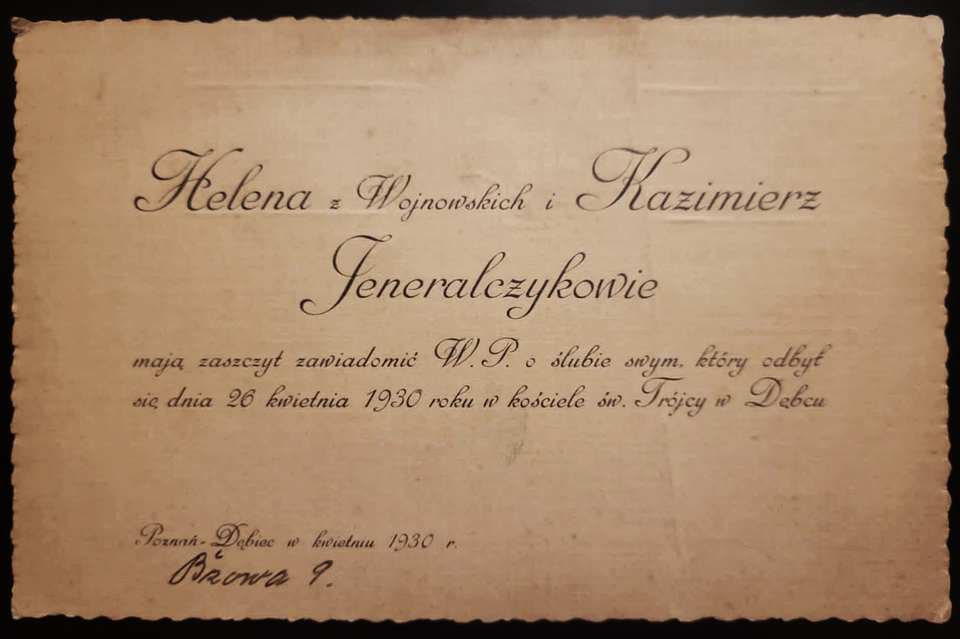 Poprzedni obrazek Następny obrazek KazimierzHelena Zawiadomienie ślubne Kazimierza Jeneralczyka i Heleny de domo Wojnowskiej w 1930 roku w Poznaniu Dębcu. Zdjęcie ze zbiorów pozostawionych przez żonę, Leokadię Jeneralczyk