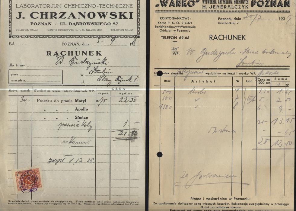 Rachunki ze zbiorów Składu Kolonialnego W.Budzyńskiego z Szubina, wystawione przez Laboratorium Chemiczno-Techniczne, J. Chrzanowski z Poznania za dostawę asortymentów proszków oraz rachunek wystawiony przez WARKO, Wytwórnię Artykułów Korkowych, Heleny Jeneralczyk (stryjenki) za dostawę asortymentów korków. Zdjęcia z oferty aukcyjnej.