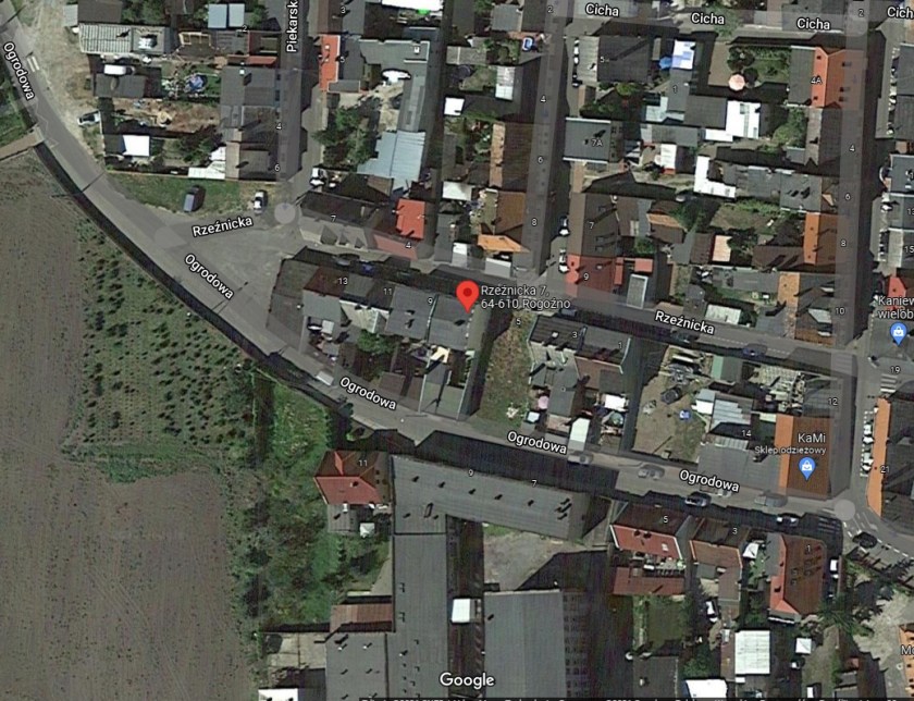 Poprzedni obrazek Następny obrazek G-RogRzeźnicka7 Powiększenie widoku satelitarnego uliczek wokół Małego Rynku Rogoźna 2021.