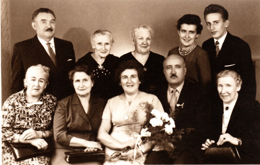 25 lecie Heleny i Władysława. Goście a wśród nich stoją wujek Stanisław Michalski, ciocia Marysia z Odolanowa, Pani Maria Skupińska z Chojen, Joasia, Ja – siedzą ciocia Zosia Michalska, przyjaciółka Mamy z Łodzi, Mama, Tata, ciocia Józefa Rulczyńska.