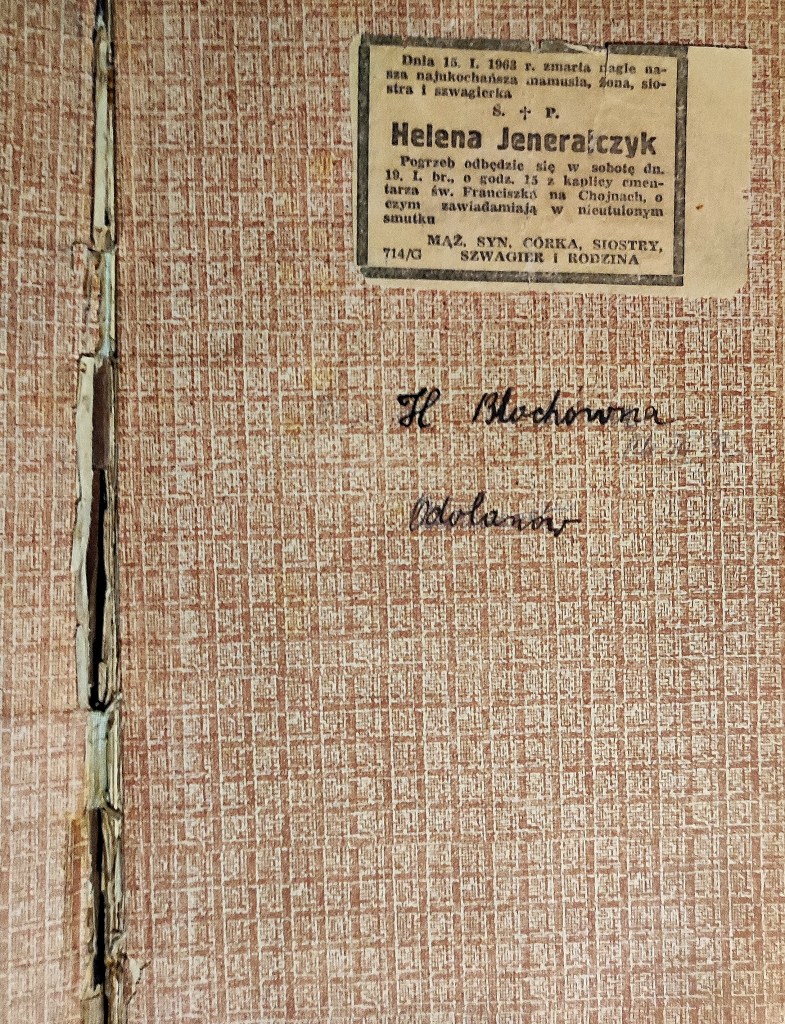 Po wielu dziesięcioleciach odnaleziony wycinek z nekrologiem mamy Heleny. Był wklejony pod okładką podręcznika do historii należącego do Haliny Bloch – podopiecznej mojej cioci Marysi z Odolanowa. Zagadką jest jak, ta książka trafiła do Łodzi i do naszego księgozbioru.