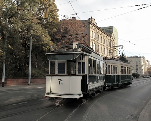 Poprzedni obrazek Następny obrazek lilpop+herbrand-ws Wagon motorowy typu Lilpop III ciągnie doczepkę typu Harbrand z otwartymi peronami po ulicach Łodzi w 2013 roku na 115 lecie MPK.