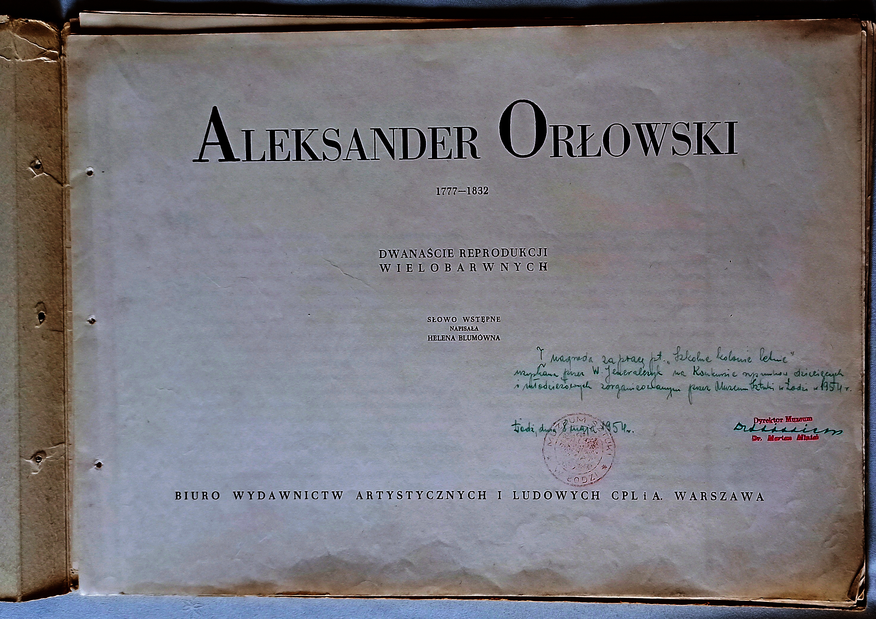 Poprzedni obrazek Następny obrazek NagrodaMS1 Album reprodukcji Aleksandra Orłowskiego z dedykacją I Nagrody w II Konkursie Rysunków MS w 1954 roku.