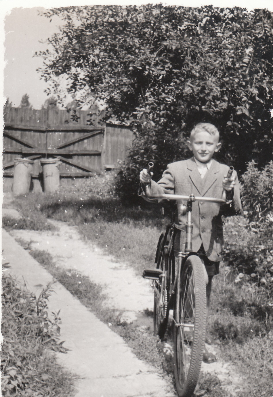 Poprzedni obrazek Następny obrazek sierpień1954 Ja przy pożyczonym od znajomego rowerze, na Helskiej 1954 r.
