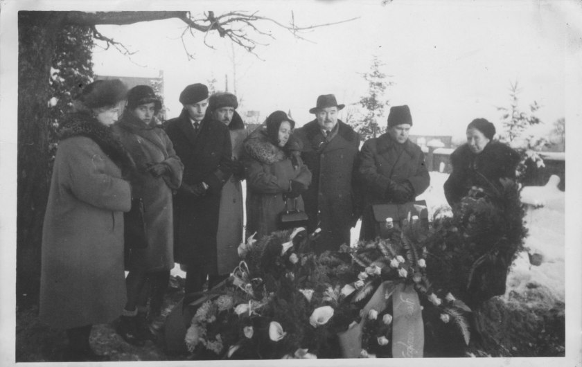Poprzedni obrazek Następny obrazek Sty-1963 Pogrzeb Mamy Heleny, zmarła nagle 15 stycznia 1963 roku. Od lewej stoją kuzynka Wanda de domo Tomczak, Joanna, ja, Tata, wujostwo Zofia i Stanisław Michalscy, ksiądz Seweryn Tomczak kuzyn Taty brat Wandy, ciocia Józefa Rulczyńska.