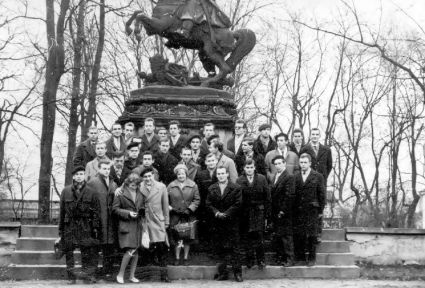 Poprzedni obrazek Następny obrazek W-wa1962-8 Wycieczka do Wilanowa, jesień 1962 roku, stoję mniej więcej w środku w jasnym prochowcu , lewym profilem.