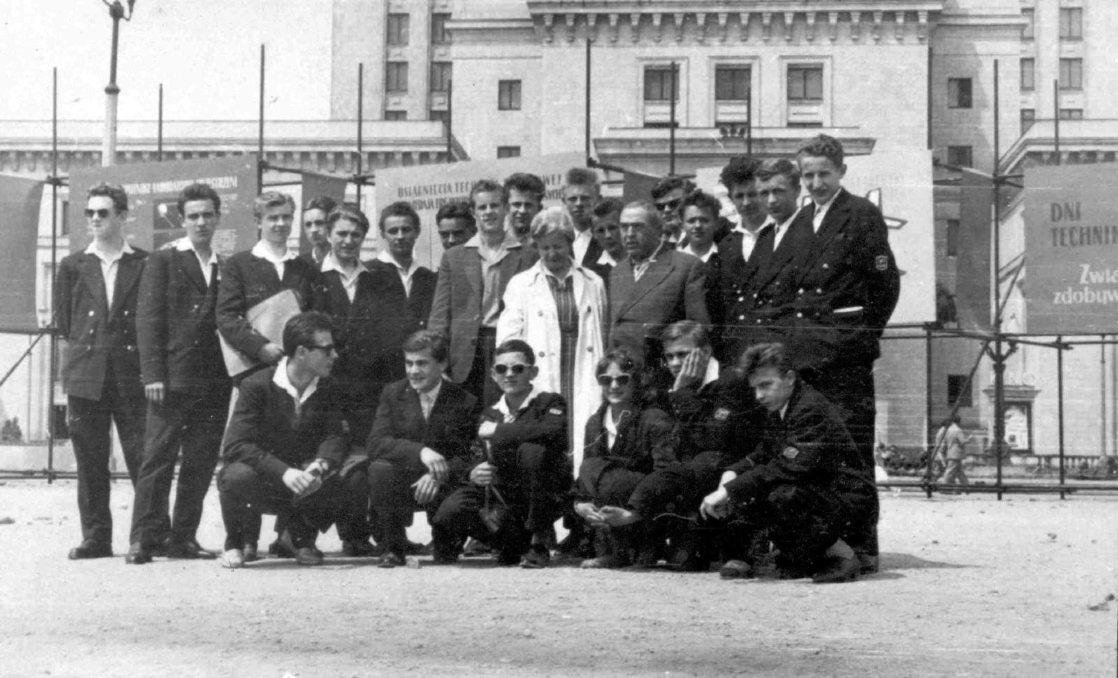 Poprzedni obrazek Następny obrazek wycieczka TE Wycieczka do Warszawy, wiosna 1962 roku. Wychowawczyni prof. Leokadia Grześkowiak, obok kierownik Warsztatów. Stoję pierwszy od prawej.
