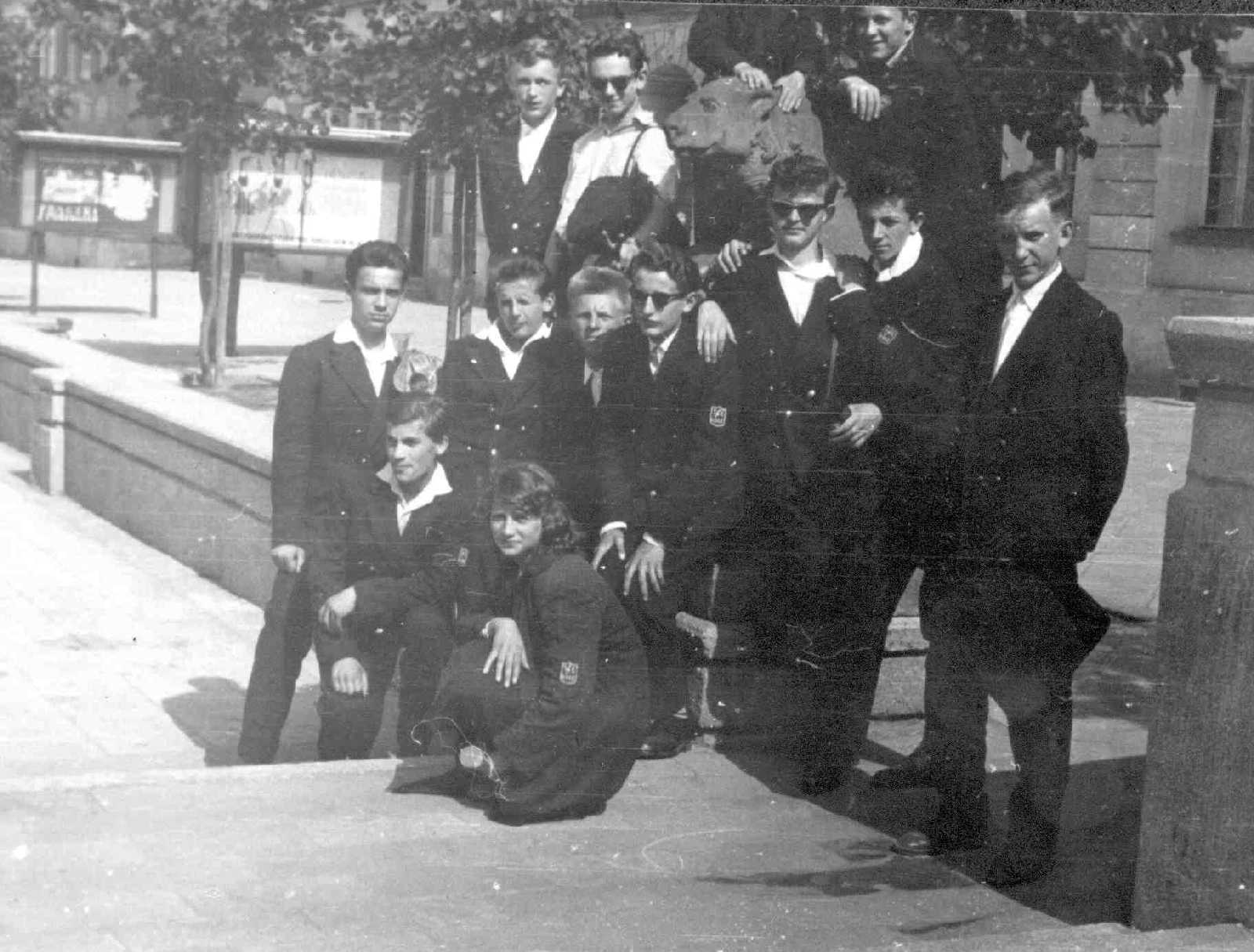 Poprzedni obrazek Następny obrazek wycieczka TE Wycieczka do Warszawy, wiosna 1962 roku. Stoję trzeci od prawej nad Jadzią Wysocką.