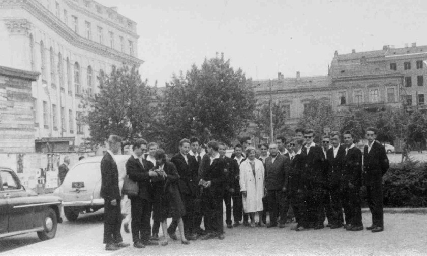 Poprzedni obrazek Następny obrazek wycieczka TE Wycieczka do Warszawy, wiosna 1962 roku. Wychowawczyni prof. Leokadia Grześkowiak, obok kierownik Warsztatów. Stoję piąty od lewej za Jadzią Wysocką.