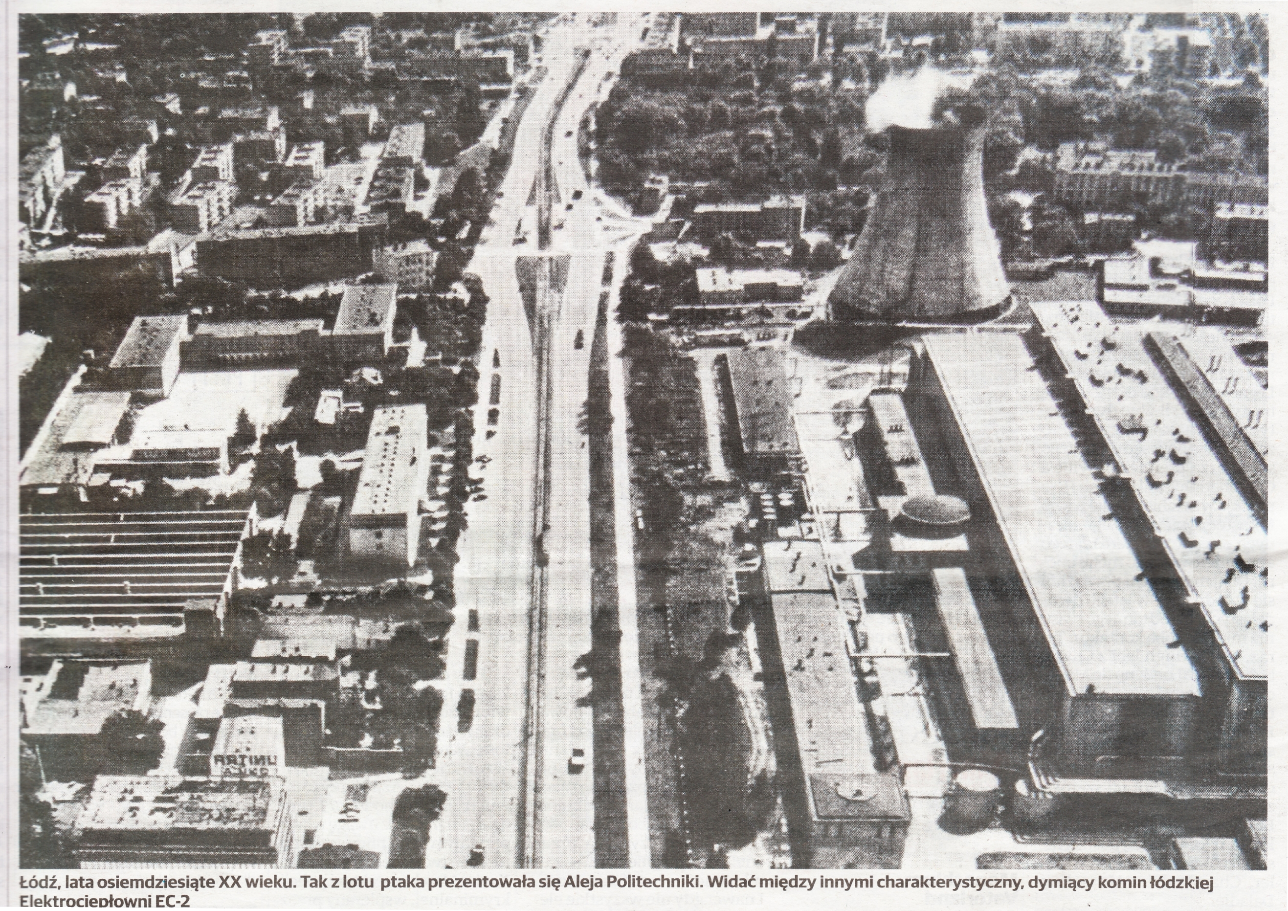 Lata 80 – XX wieku, zdjęcie prasowe pokazuje po prawej chłodnie EC II z kłębami unoszącej się pary wodnej a po lewej widoczne budynki Szkoły ZS nr 9. Dobrze widoczny wielki plac boisk głównych. między skrzydłami wschodnim i zachodnim, łącznik mieszczący salę widowiskową i salę gimnastyczną.