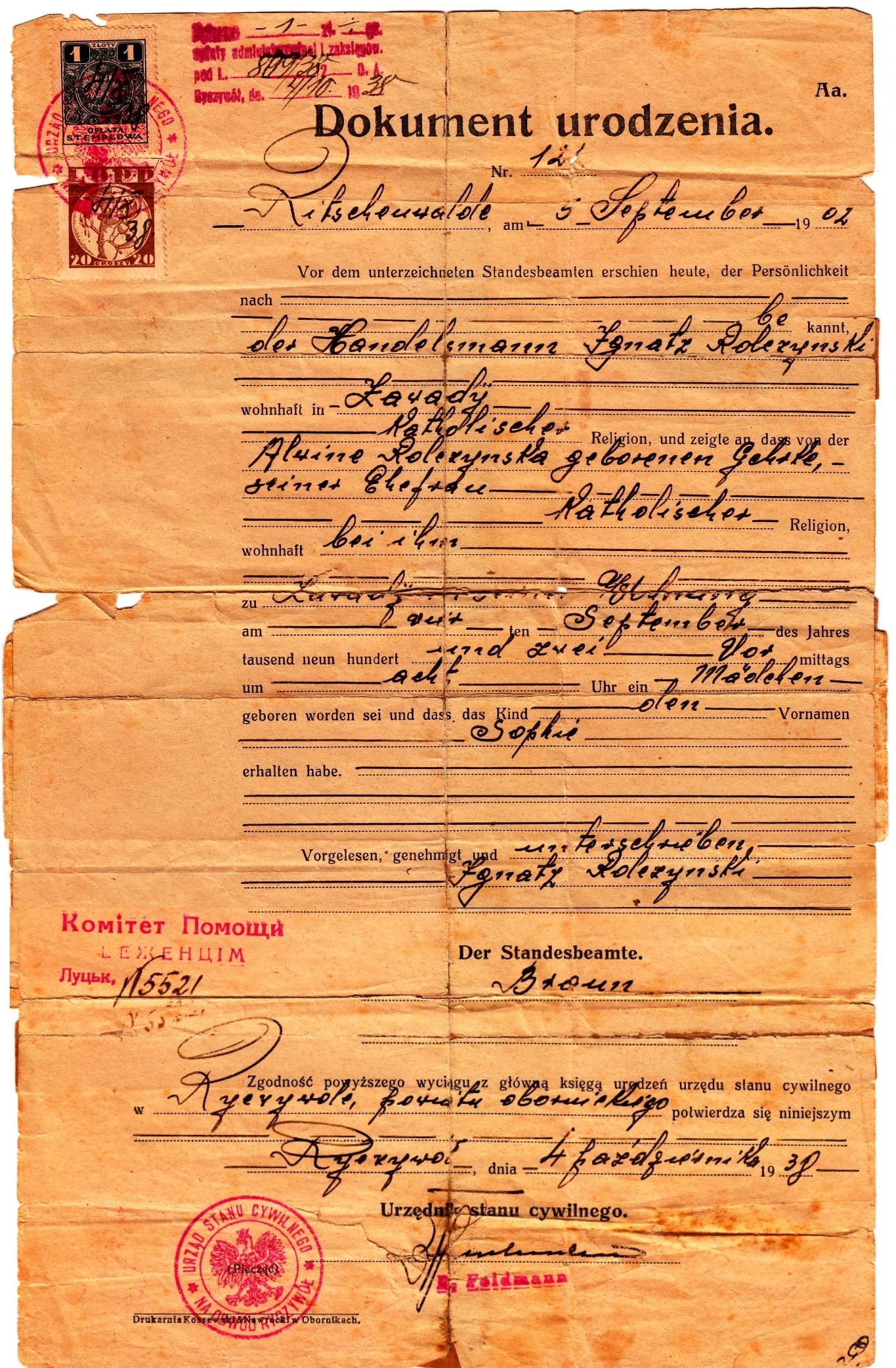 Dokument Zofii Rulczyńskiej z 1938 roku