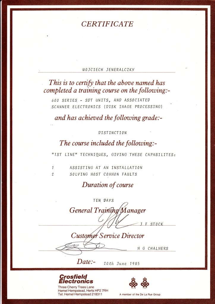 Poprzedni obrazek Następny obrazek Crosfield Kursy w Crosfield Electronics London – Watfort 8.5.1985 do 16.06.1985. Instalowanie, skalowanie, naprawa i technika skanerów do wyciągów wielobarwnych, bębnowych serii 600.