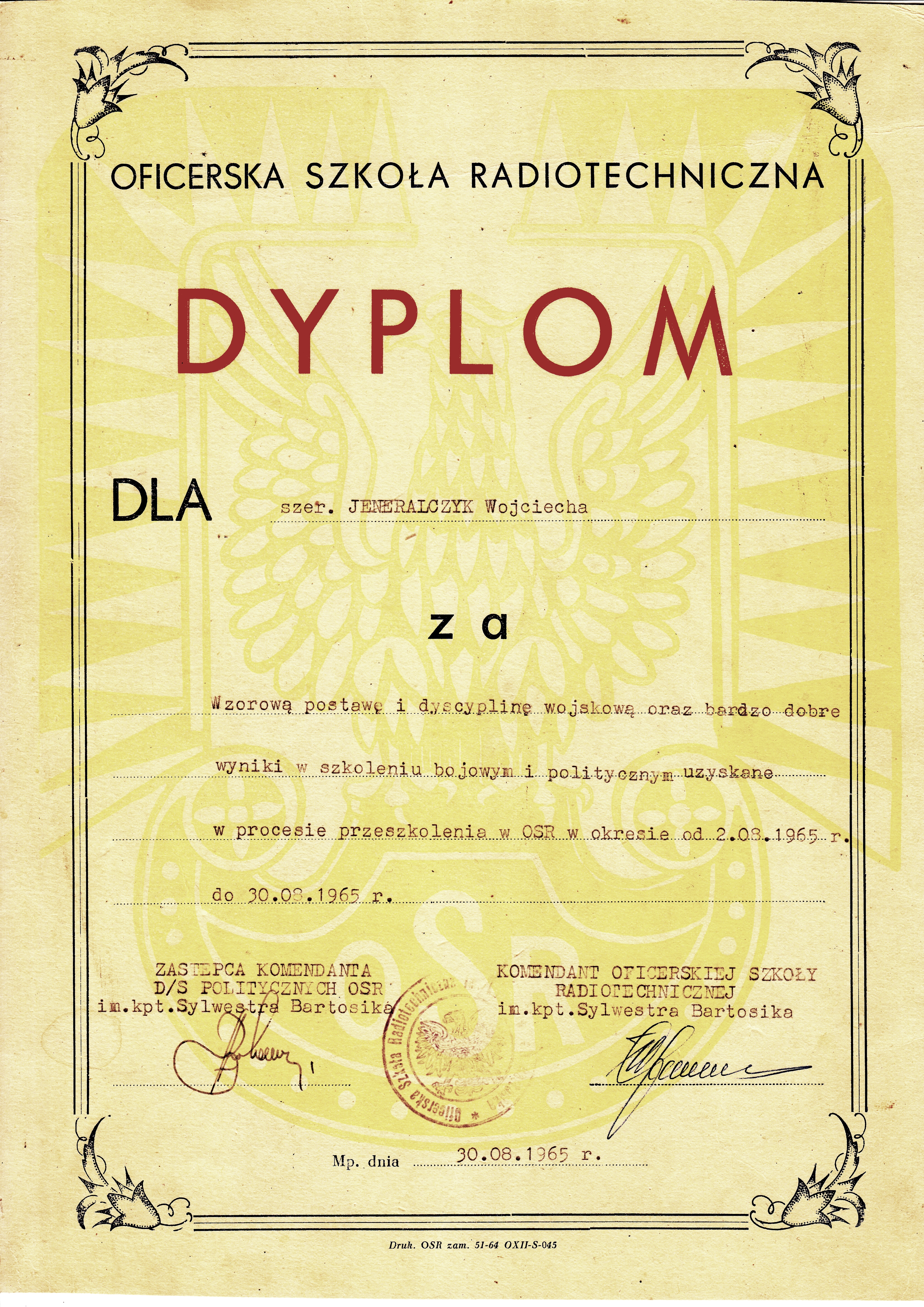 Poprzedni obrazek Następny obrazek DypOSZWR 1965 rok, Dyplom za wzorową postawę i bardzo dobre wyniki szkolenia bojowego w Oficerskiej Szkole Radiotechnicznej.
