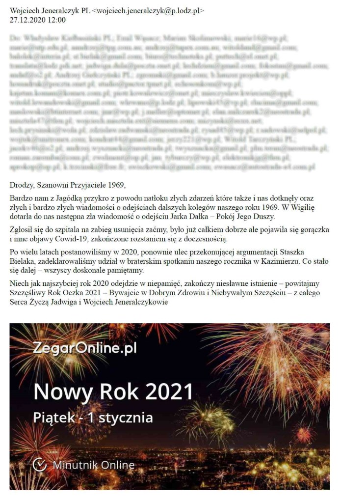 Fotokopia emaila z życzeniami Noworocznymi. 2021 roku