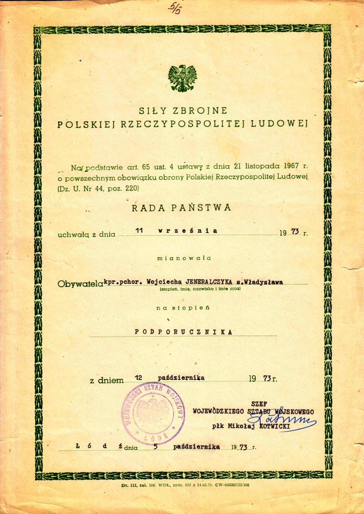 Poprzedni obrazek Następny obrazek Oficer1973 Akt Mianowania na Podporucznika Wojska Polskiego wręczony 12 października 1973 roku.