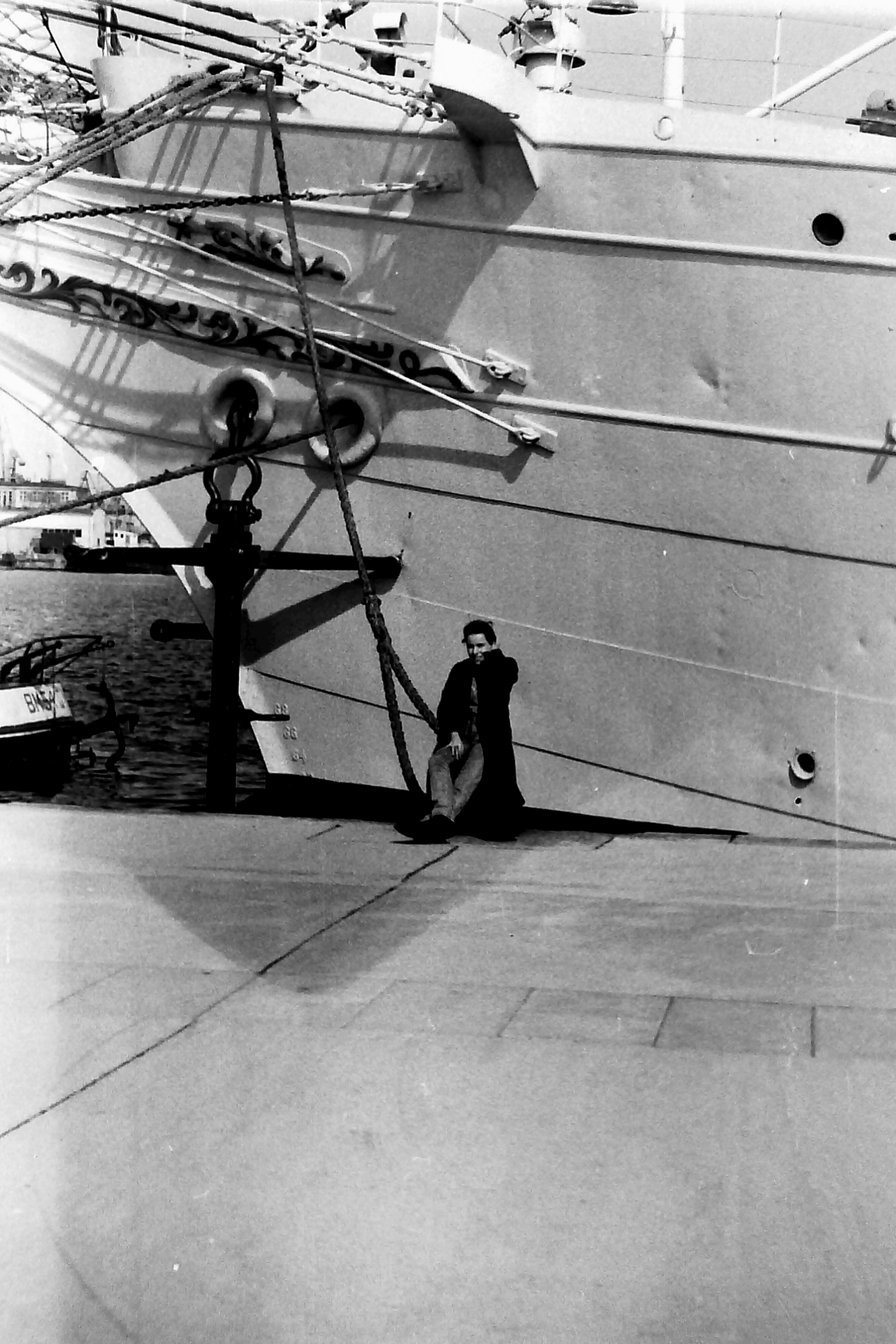 Poprzedni obrazek Następny obrazek 1989-j5 1989 – Gdynia, Ania siedzi na cumie Daru Młodzieży.. Po lewej widoczna kotwica.
