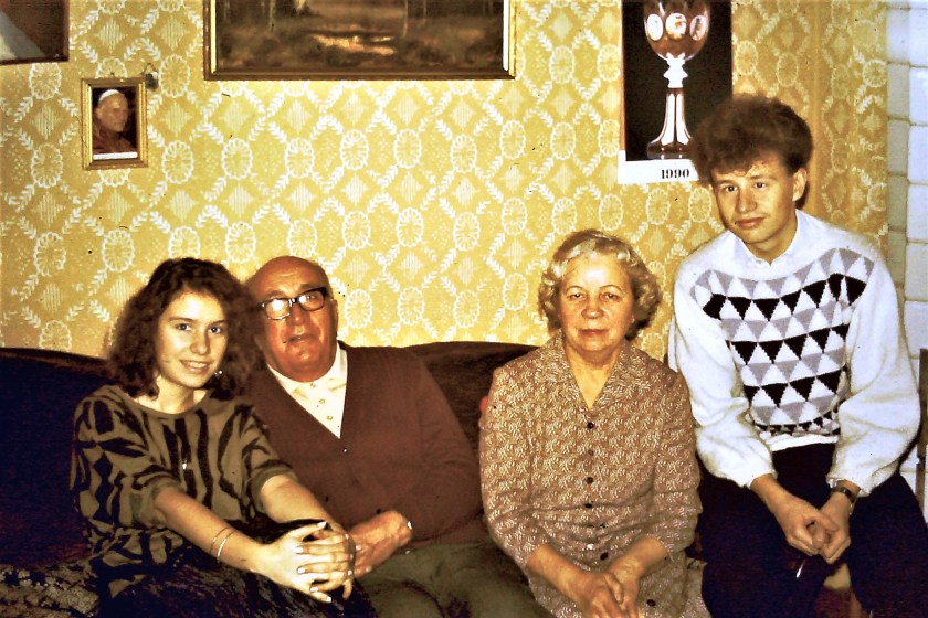 Poprzedni obrazek Następny obrazek 1989Helska1 1990 – Ania i Adaś z Dziadkami Władeczkiem i Jadzią siedzą na kanapie gondoli na ulicy Helskiej w domku dziadków.