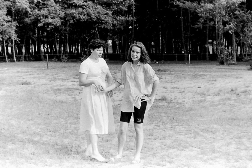 Poprzedni obrazek Następny obrazek 1990-6 1990 – Księże Młyny nad Wartą, Ania i Jagódka podczas spaceru po leśnej okolicy OW Almatur.