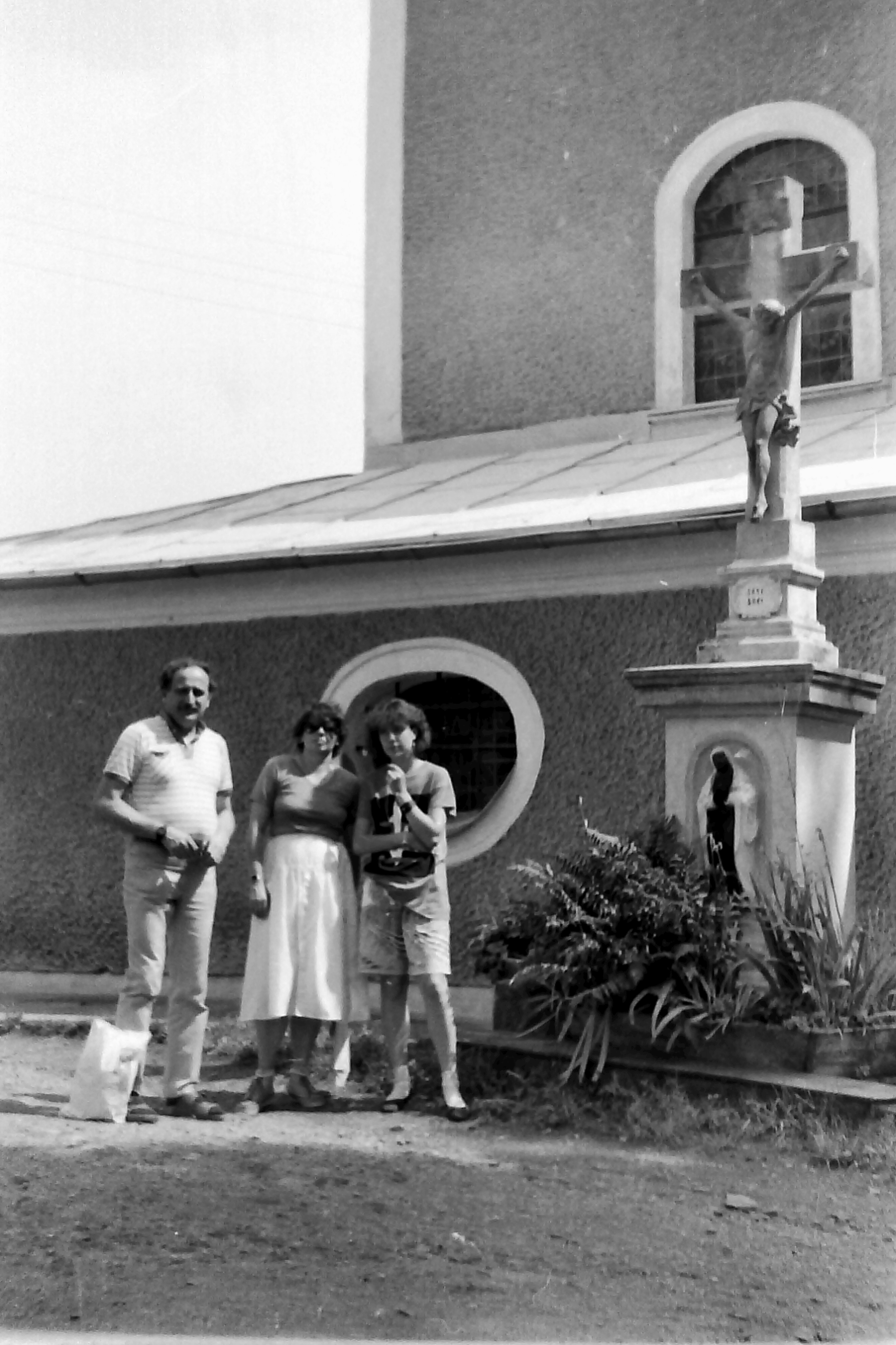 Poprzedni obrazek Następny obrazek 1991-17 1991 – my z Anią przed Sanktuarium MB Śnieżnej u celu długiej wyprawy na Igliczną w Międzygórzu. Reszta wycieczki już dawno schodziła do swych siedzib ale my szczęśliwi że Jagódka dała radę !.