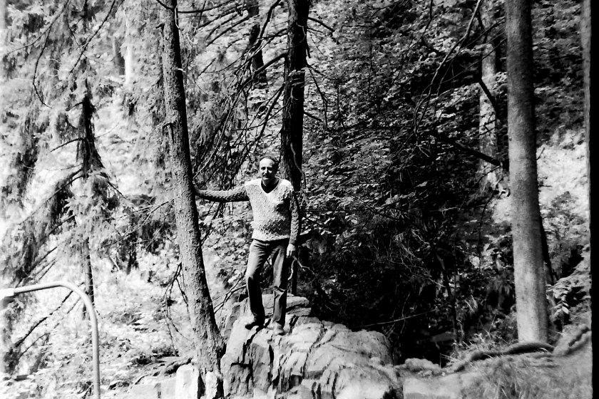 Poprzedni obrazek Następny obrazek 1991-6 1991 – wodospad rzeki Wilczka, widoczny dalszy przebieg trasy spacerowej za mostem biegnący nawisami, stoję na skałach nad urwistym zapadliskiem otoczenia wodospadu.