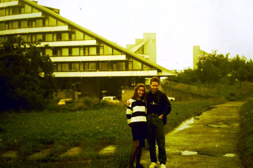 Poprzedni obrazek Następny obrazek 1992-5 1992 – Ania i Adaś na tle charakterystycznej, namiotowej bryły naszego ośrodka wczasowego pracowników dawnego KRiTV.