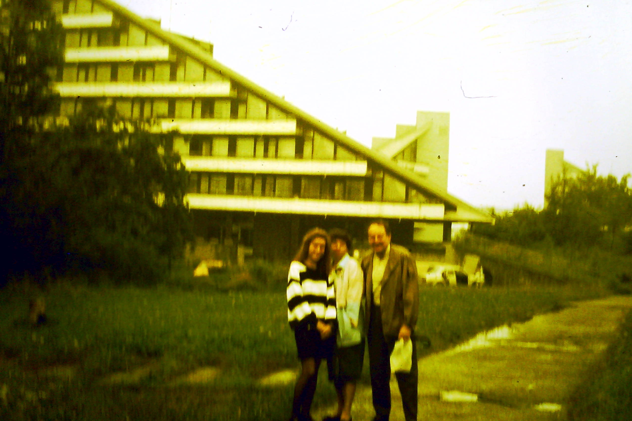 Poprzedni obrazek Następny obrazek 1992-7 1992 – Jagódka, ja i Ania na tle charakterystycznej, namiotowej bryły naszego ośrodka wczasowego pracowników dawnego KRiTV.