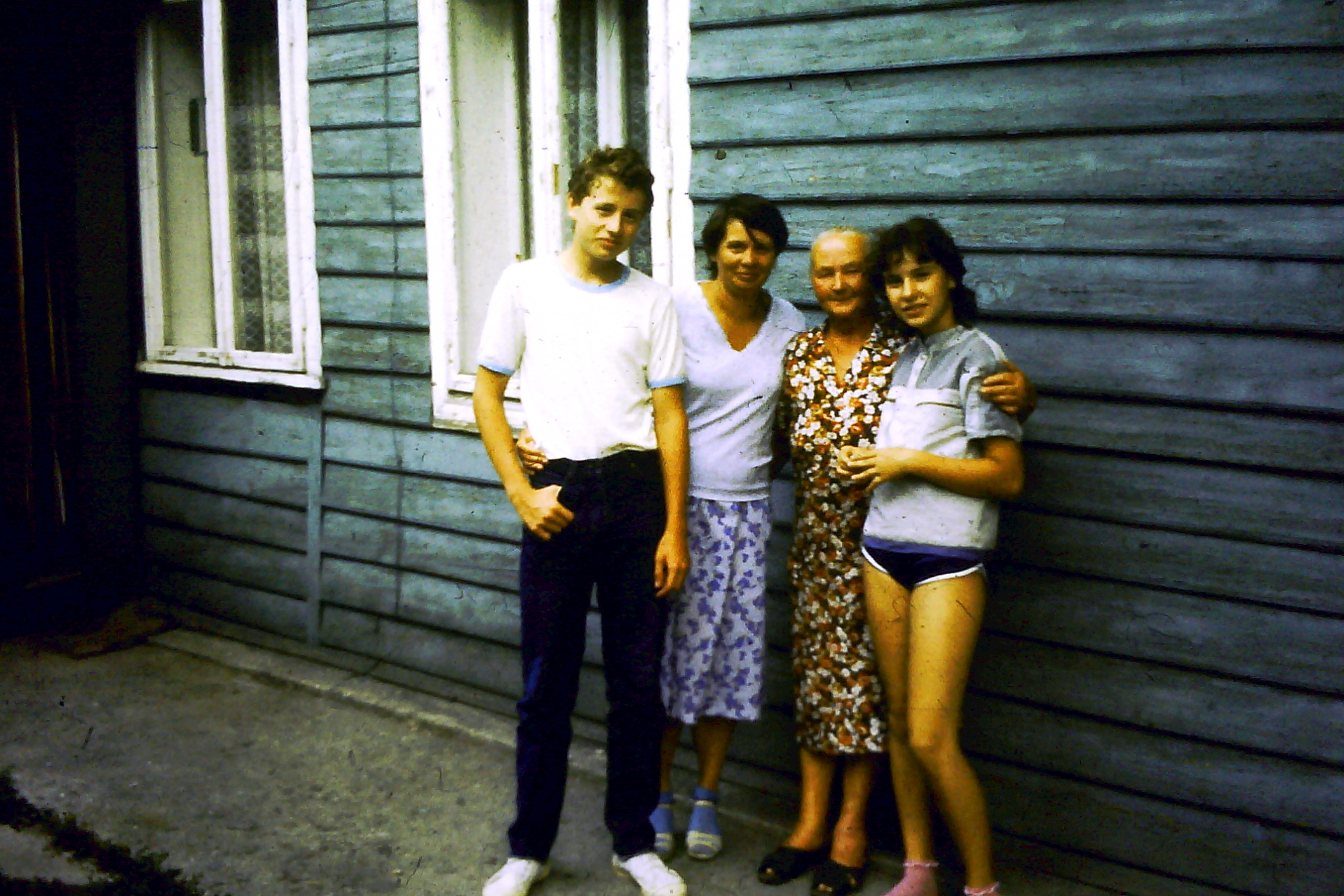 Poprzedni obrazek Następny obrazek 87-1 1987 – Barcice, zdjęcie pamiątkowe z Babcią Porębską przed jej domkiem.