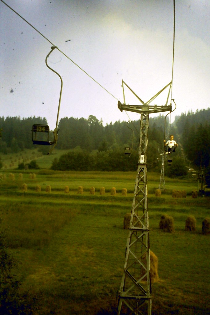 Poprzedni obrazek Następny obrazek Czantoria-2 1983 – Adaś z tatą podczas wycieczki z Ustronia, wjazd wyciągiem krzesełkowym na Czantorię.