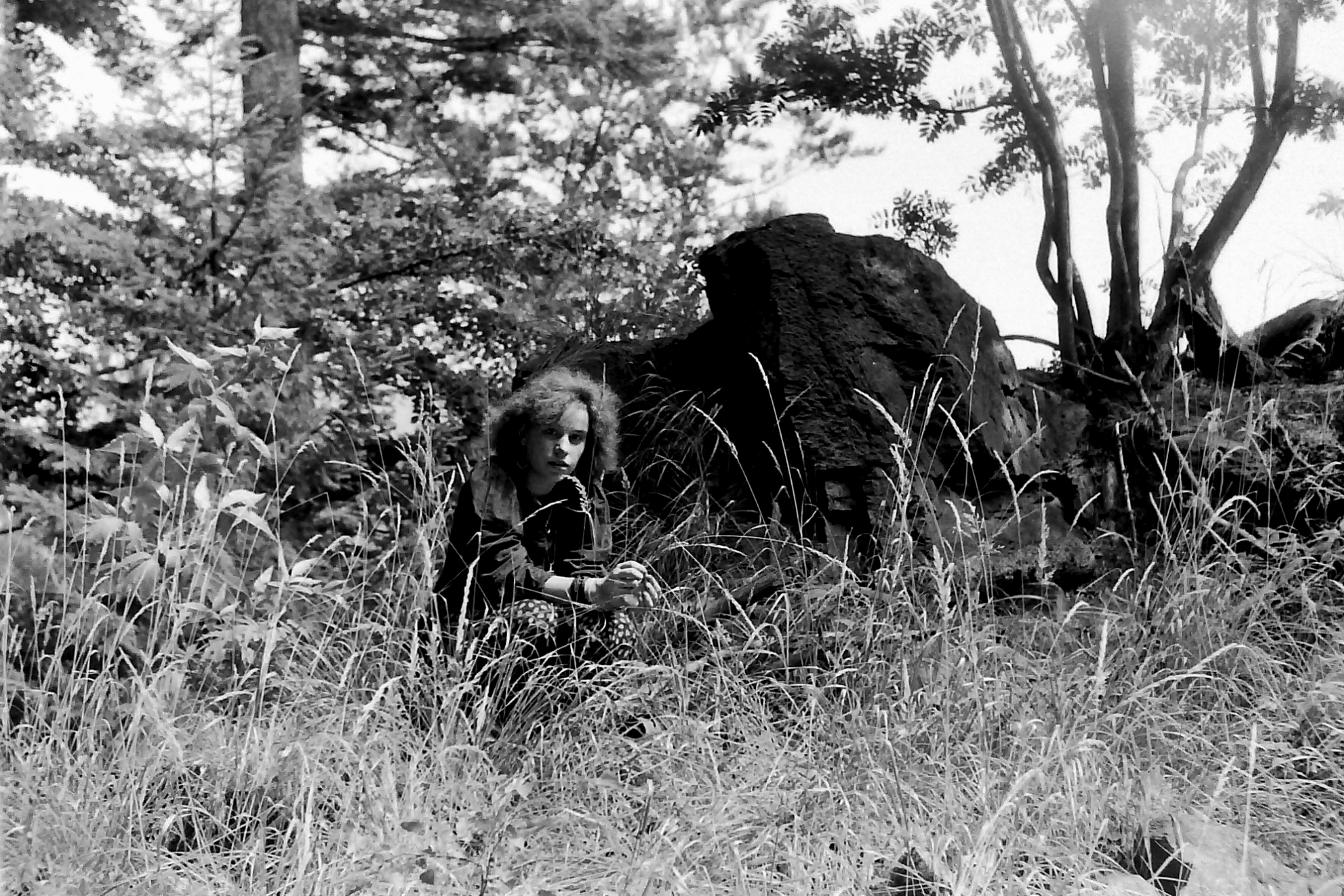 Poprzedni obrazek Następny obrazek czarny głaz-1 1991 – wyruszamy na dłuższy spacer leśnymi ścieżkami do atrakcji turystycznej – Ogród Bajek położony daleko, jeszcze za licznymi porębami tzw. łąkami myśliwskimi. Krótki odpoczynek przed czarą skałą.