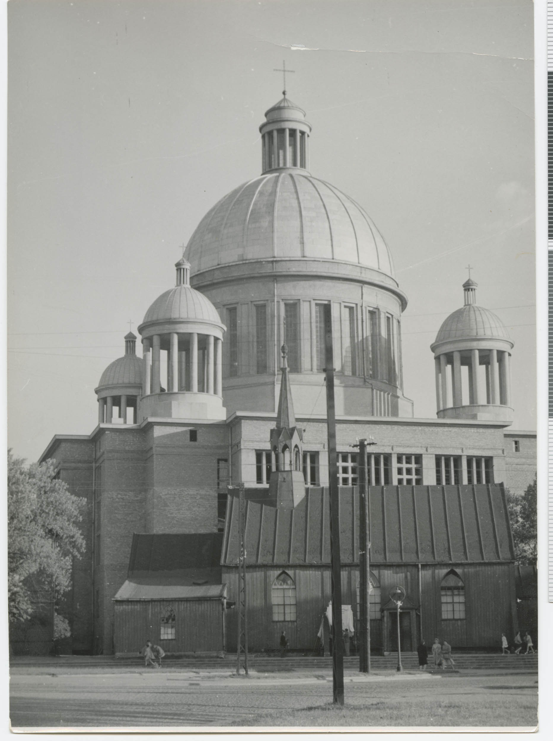 Poprzedni obrazek Następny obrazek DrewnianyKościółŚw.TeresyObokBazyliki Kościół pierwszokomunijny Jagódki (drewniana świątynia – dawny kościół św. Wojciecha, przywieziony z Chojen i konsekrowany przy Pomorskiej jako św. Tereski. W tle – prawie gotowa nowa bazylika św. Teresy oraz św. Jana Bosko.
