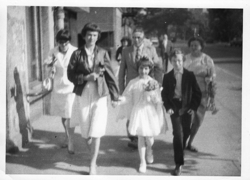 Poprzedni obrazek Następny obrazek IKomAni-2 1982 – idziemy do Archikatedry Łódzkiej do pierwszej komunii Ani. Mama, Zdzisia Skórzewska żona chrzestnego ojca Ani, Leszka idącego tuż za Anią. Dalej Adaś i babcia Henia Frej- Gąciarz.