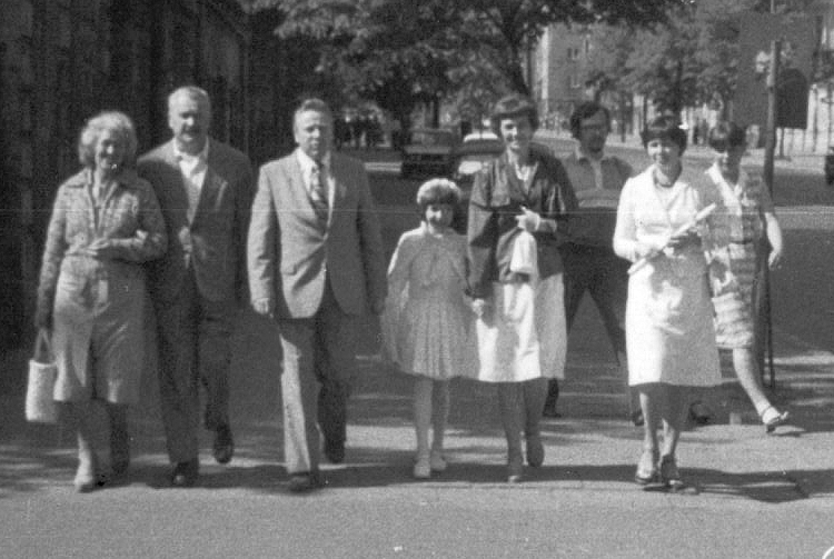 Poprzedni obrazek Następny obrazek IKomAni-3 1982 – idziemy do Archikatedry Łódzkiej do pierwszej komunii Ani. Stoją od lewej Krystyna i Zdzisław Skórzewscy, Lesław i Zdzisława Skórzewscy trzymają Anię za rączki, dalej mamusia Jagoda.