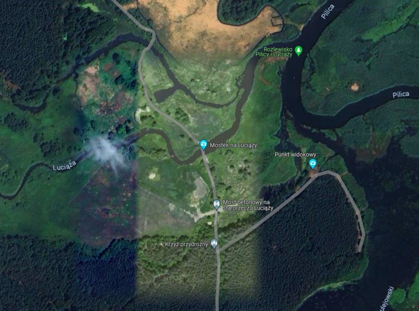 Poprzedni obrazek Następny obrazek LuciMurow Zdjęcie lotnicze Google, okolic młyna Murowaniec, fragmentu ujścia luciąży do Pilicy oraz początku Zalewu Sulejowskiego