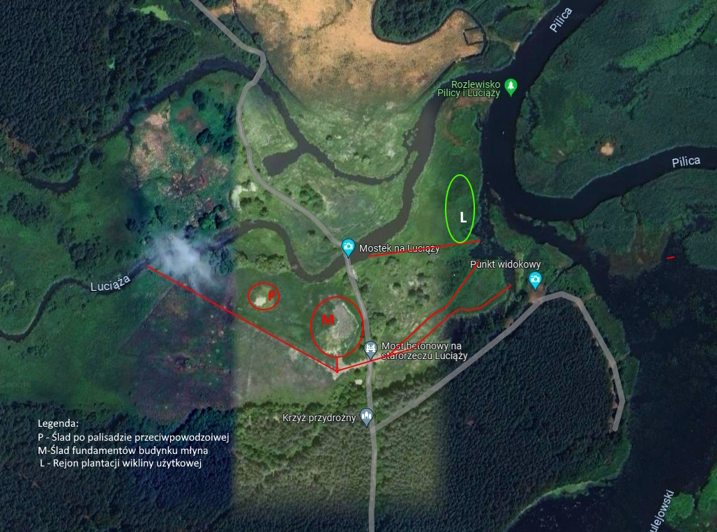Poprzedni obrazek Następny obrazek MłynMurow Na czerwono zaznaczono Starorzecze Luciąży, wtedy było kanałem roboczym młyna z jazem oraz śluzą ilości spływu; na koło napędowe czy opływem obok koła młyna wodnego Murowaniec.