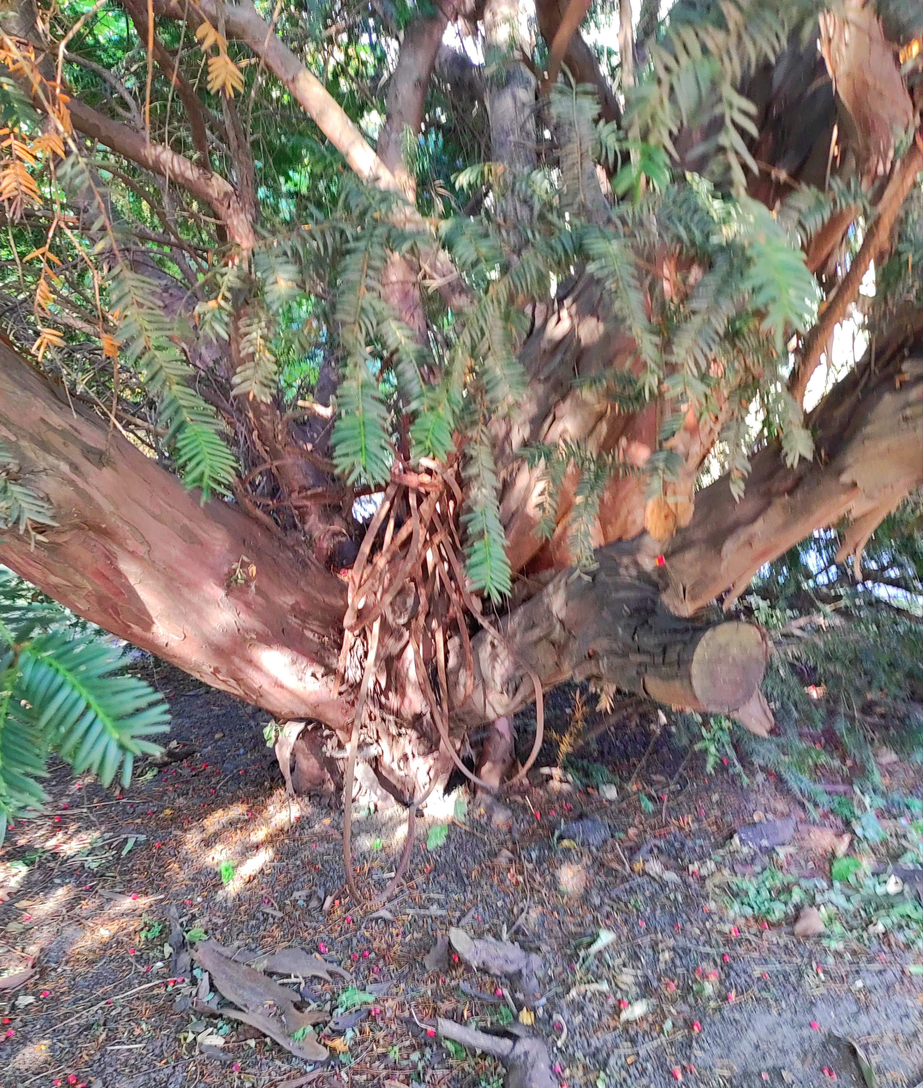 Poprzedni obrazek Następny obrazek Pień Cis 2023-widok z chodnika Piotrkowskiej 241. Widok pnia u nasady jednego z najstarszych cisów rosnących na terenie naszego miasta.