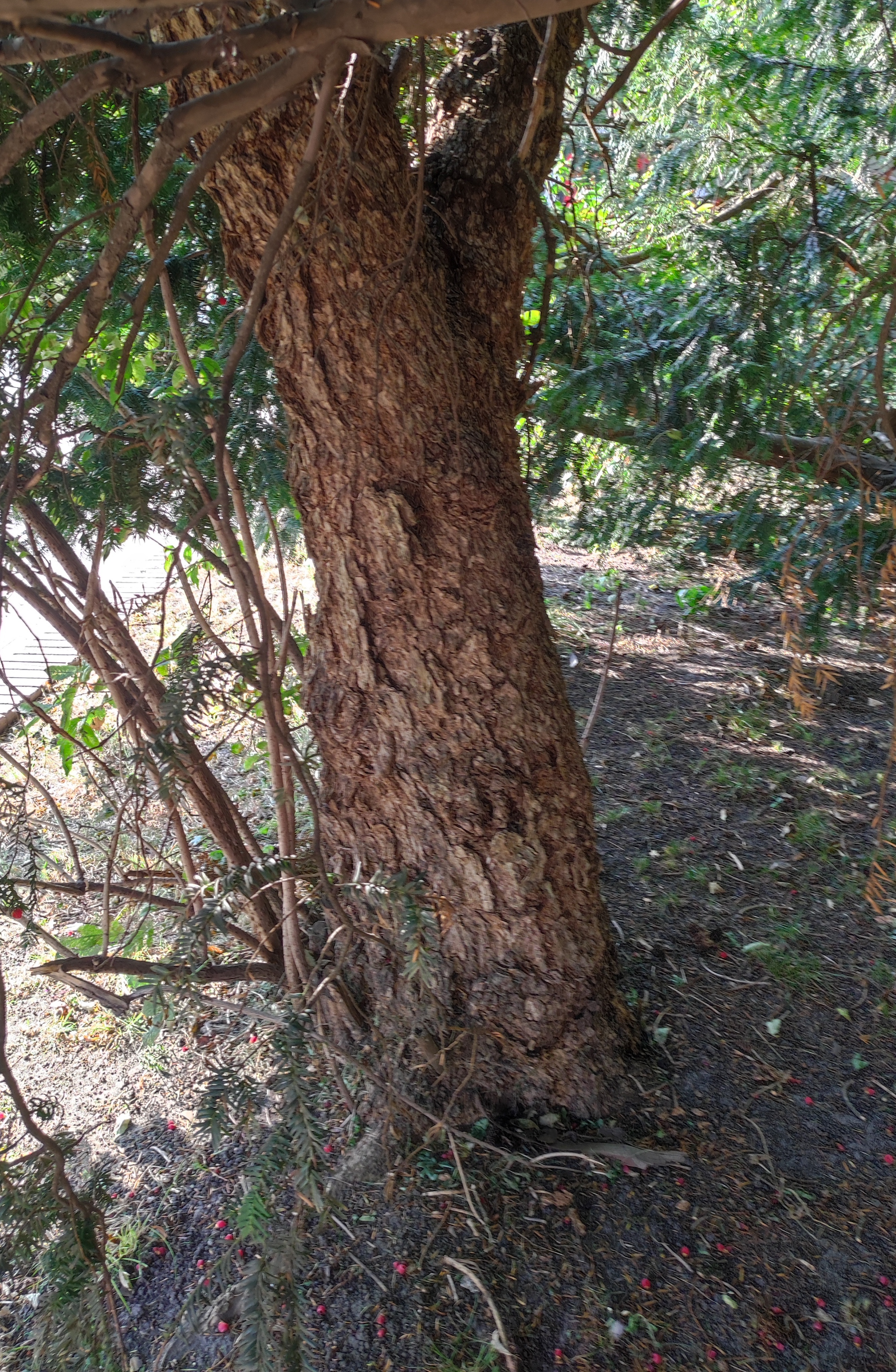 Poprzedni obrazek Następny obrazek PieńBzu 2024-współczesny widok z chodnika ulicy Piotrkowskiej na pień okazałego czarnego bzu o obwodzie pnia blisko 140 cm u nasady.