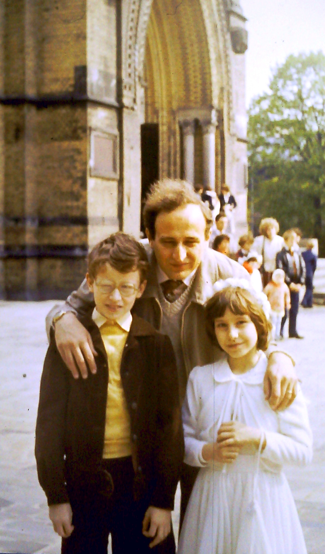 Poprzedni obrazek Następny obrazek PK 1982-2 1982 – ujęcie po pierwszej komunii. Tatuś z dziećmi Adasiem i Anią.
