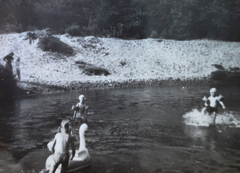 Poprzedni obrazek Następny obrazek PrzygłówLu1977 1977 – Przygłów, Luciąża Ania, Adaś z koleżanką, kąpią się używając dmuchanego łabędzia oraz rękawków pływackich przywiezionych z Czechosłowacji w 1973 roku.