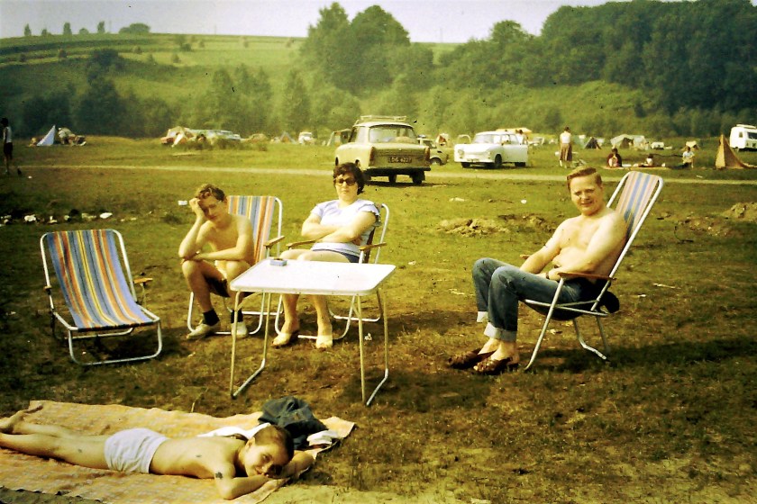 Poprzedni obrazek Następny obrazek Rożnów81 1981 – Ania, Adaś z mamą i wujkiem na kempingu obok zbiornika Rożnowskiego. Na drugim planie widoczny nasz odnowiony po remoncie Trabant 600.