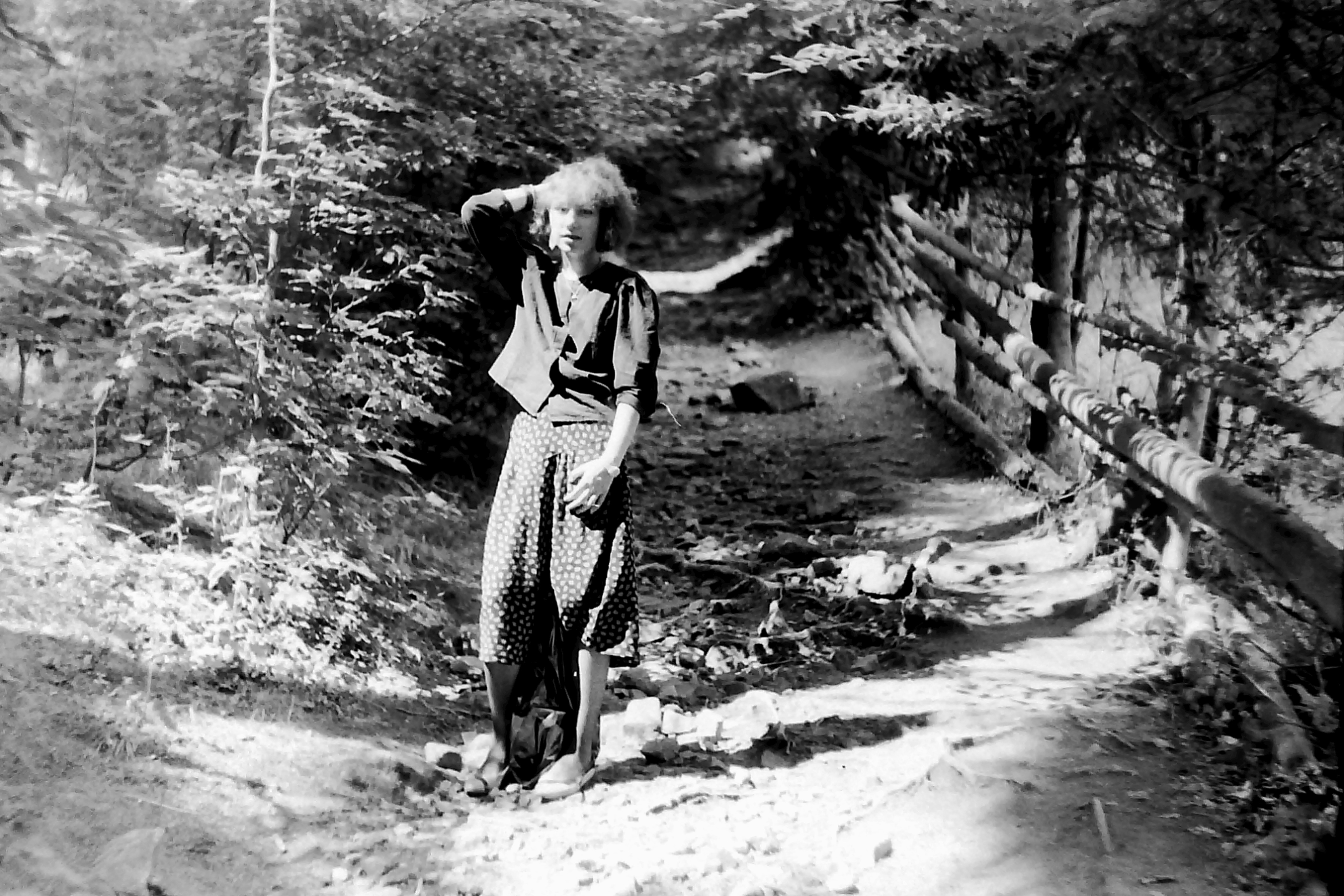 Poprzedni obrazek Następny obrazek wDrodzeAnn 1991 – wyruszamy na dłuższy spacer leśnymi ścieżkami do atrakcji turystycznej – Ogród Bajek położony daleko, jeszcze za licznymi porębami tzw. łąkami myśliwskimi. Krótki odpoczynek przed potokiem..