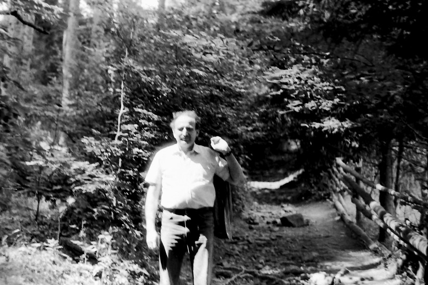 Poprzedni obrazek Następny obrazek wDrodzeJa 1991 – wyruszamy na dłuższy spacer leśnymi ścieżkami do atrakcji turystycznej – Ogród Bajek położony daleko, jeszcze za licznymi porębami tzw. łąkami myśliwskimi. Krótki odpoczynek przed potokiem.