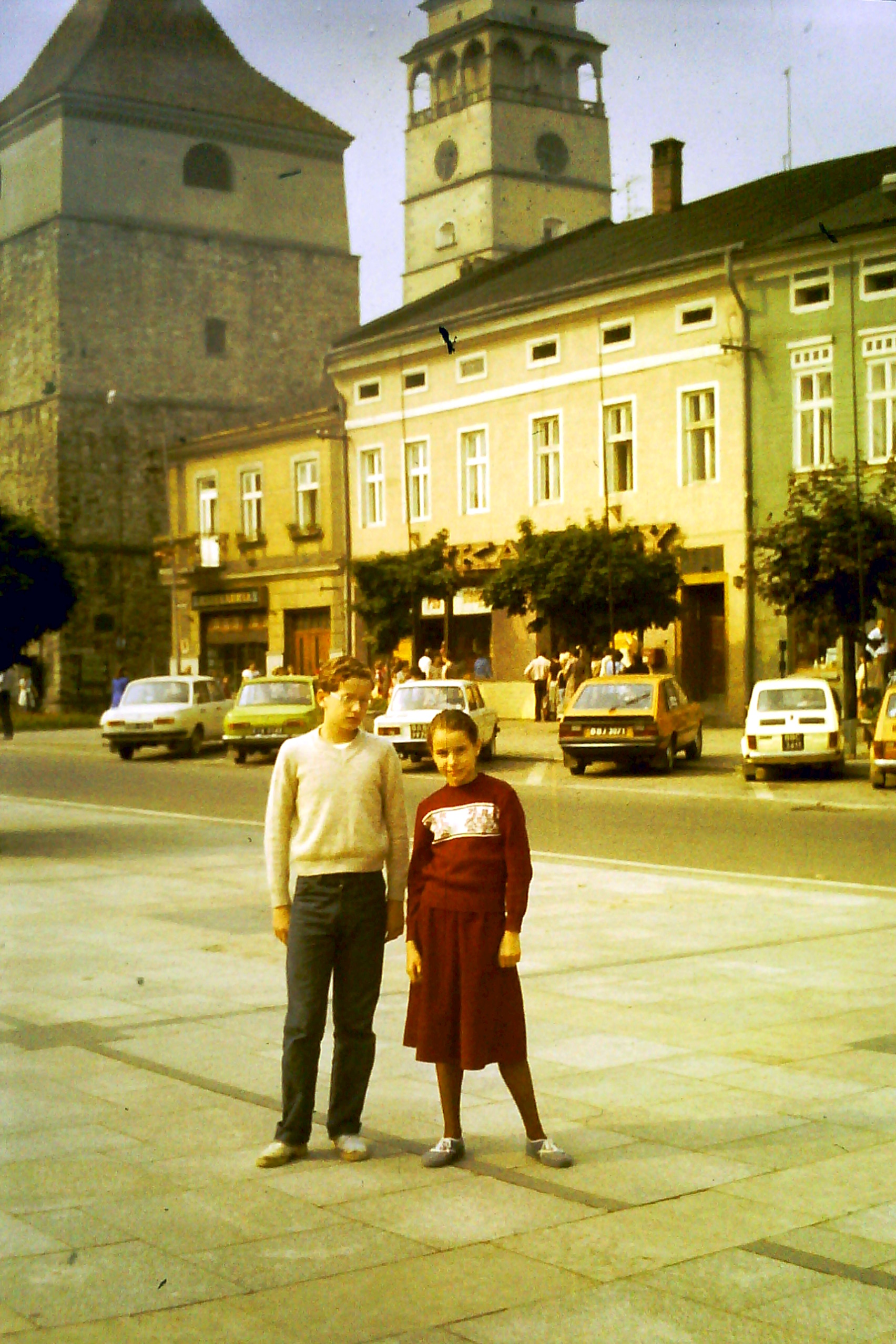 Poprzedni obrazek Następny obrazek Żywiec-2 1983 – Ania i Adaś na rynku w Żywcu podczas wycieczki z Ustronia przez Wisłę, Istebnę, Koniaków.